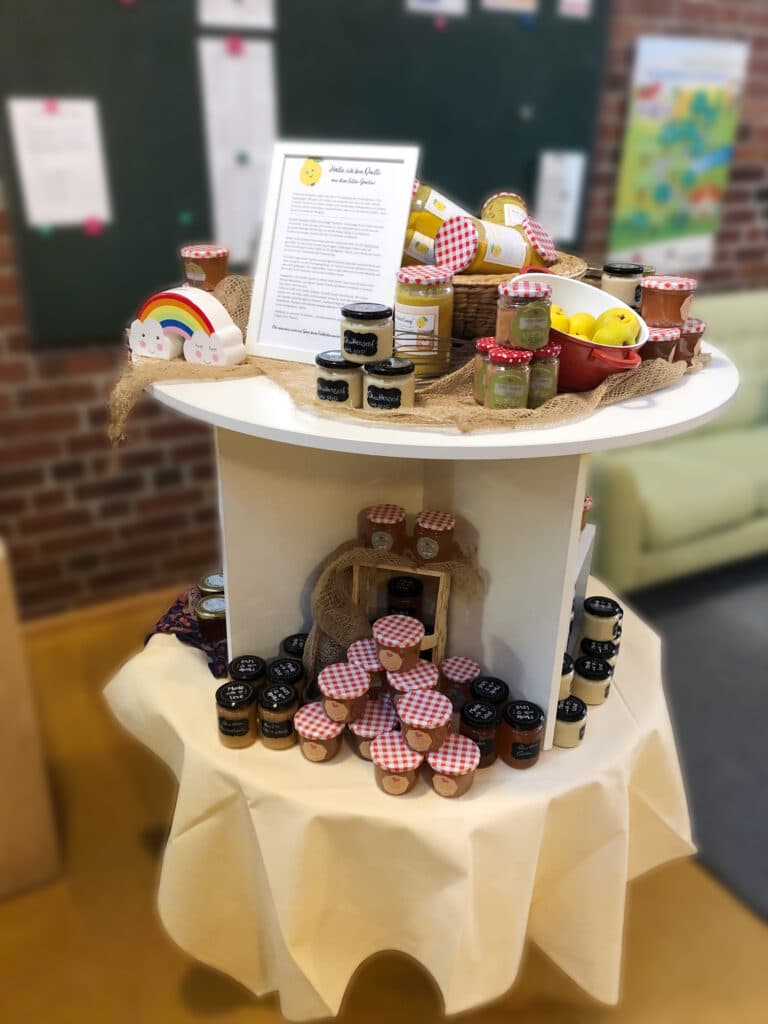 In diesem Jahr hat die Obsternte Gruppe gemeinsam geerntet, um dann zu Hause fleißig zu werkeln. Es wurde Marmelade, Gelee, Chutney, Senf, Suppe und sogar Schnaps aus Villa eigenen Produkten hergestellt. Im Anschluss hat die Gruppe einen Verkaufsaufsteller im Flur aufgestellt und wir haben fast 200 Euro Spenden für die Kinder sammeln könne. Außerdem ist Wahlscheider Kräuterschule so nett auch hier unsere Produkte gegen Spende anzubieten. Danke, für eure leckere Arbeit!